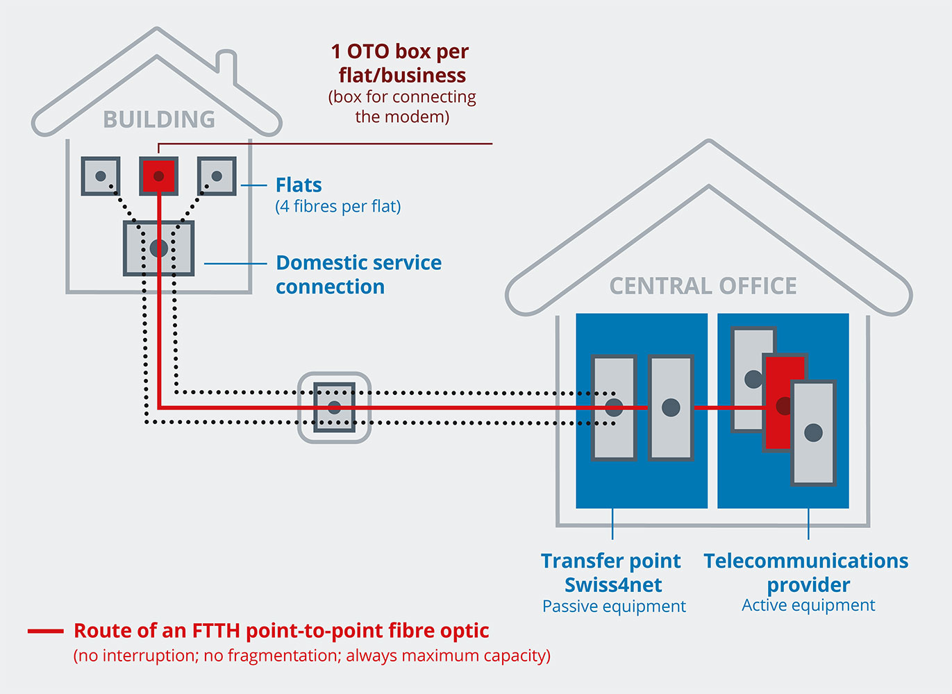 New builds on greenfield sites and vertical extensions to existing buildings in Chiasso, Vacallo, Morbio Inferiore and Balerna are generally connected to the point-to-point fibre optic network free of charge. This initial connection is implemented directly from the central office to the optical telecommunications outlet (OTO) and enables immediate use of the fibre optic connection.
